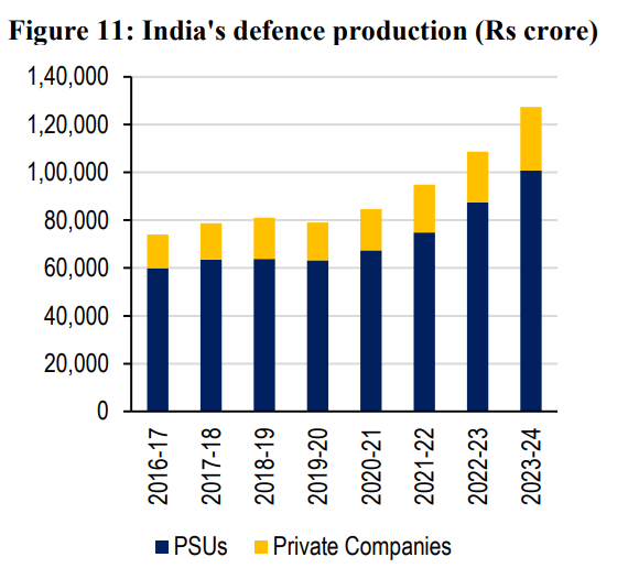 India’s defence sector is showing remarkable growth, backed by government support and strategic policy initiatives. The Ministry of Defence has been allocated ₹6,21,940.85 crore in the 2024-25 budget, representing the highest allocation among all ministries,which accounts for a 4.79% increase from the previous fiscal year. This allocation of funds shows the government’s commitment to reducing dependence on foreign military imports & technological advancements.Below is the chart where you will see the increase in India’s defence production.