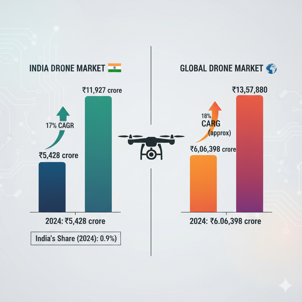 In the Indian drone market, it is 5,428 crore currently & is supposed to reach 11,929 crore by 2029, showing a 17% CAGR. The Indian drone market currently only represents 0.9% of the total global market, which shows the sector’s massive growth potential ahead.